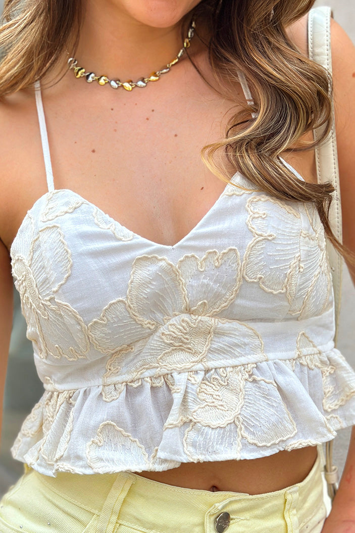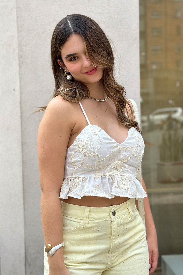 Blusa de tiras delgadas con delicado bordado floral y bolero en el ruedo que aporta un aire romántico y femenino. Su escote en forma de corazón resalta la figura con sutileza.