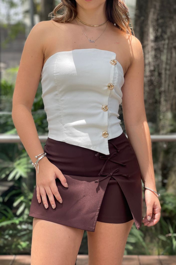Top strapless asimétrico con botones joya, elaborado en bengalina.