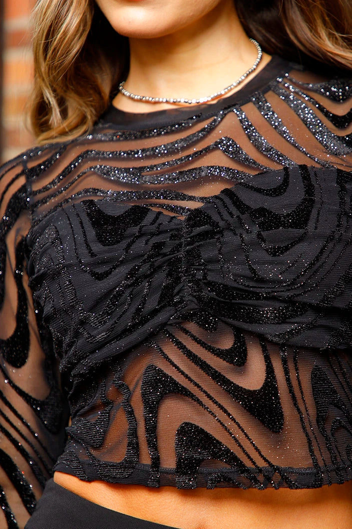 Blusa de malla transparente con un diseño bordado en ondas y aplicaciones brillantes que crean un efecto sofisticado y llamativo.