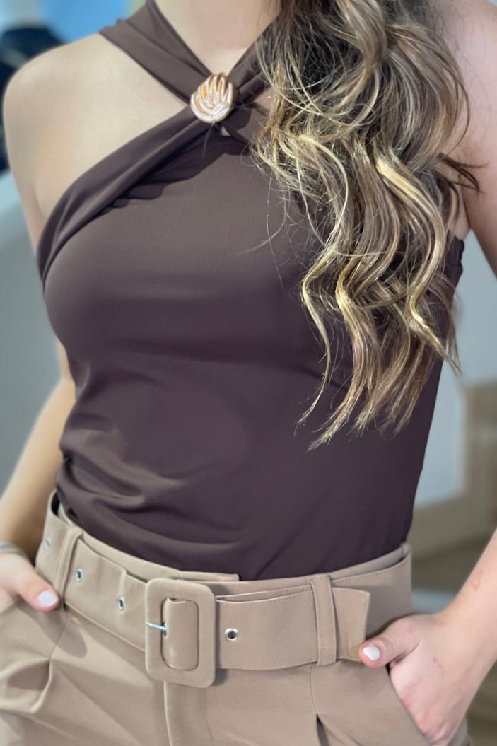 Blusa sin mangas en tono negro con diseño cruzado en el escote que se une al centro con un elegante broche dorado. Está confeccionado en una tela suave y elástica que se ajusta al cuerpo, brindando comodidad y un acabado pulido. Su corte moderno y femenino lo convierte en una pieza versátil para elevar cualquier look.