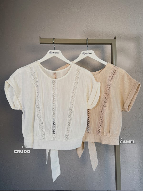 Blusa estilo romántico y bohemio. Este top en tejido crochet tiene un corte crop, mangas largas y escote en V con amarre frontal, que le da un toque femenino y artesanal. Su diseño calado lo hace fresco, ideal para climas cálidos.