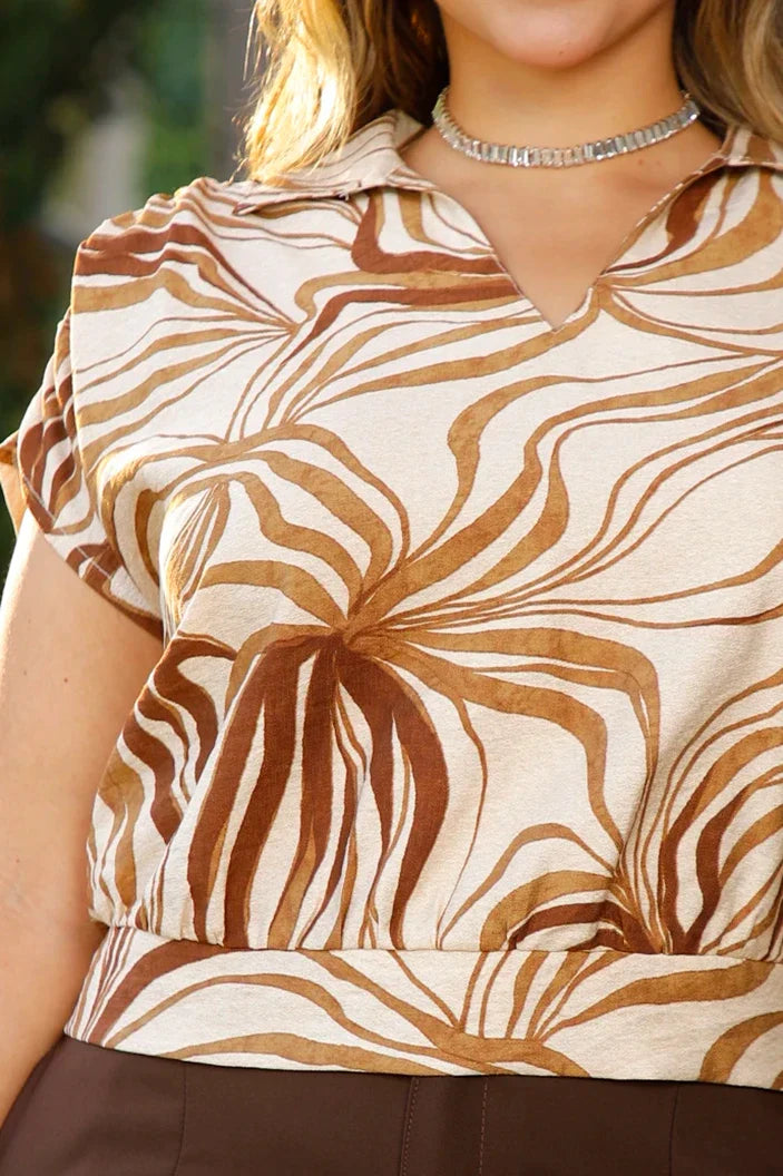 Blusa en tonos beige y marrones, confeccionada en poliéster con spandex, una tela ligera, suave y ligeramente elástica que ofrece comodidad durante todo el día. Presenta un estampado orgánico en ondas, cuello en V con solapa y mangas cortas con caída natural.