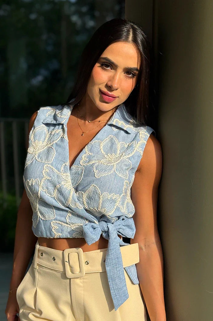 Blusa tipo crop, confeccionada en una tela de ojalillo en tono azul celeste, que destaca por sus delicados bordados florales calados. Presenta un sofisticado diseño cruzado con escote en V y un cuello camisero estructurado, finalizando con una lazada ajustable en el costado que permite entallar la prenda de forma femenina y moderna. Su diseño sin mangas y espalda cerrada la convierten en una pieza fresca y elegante.