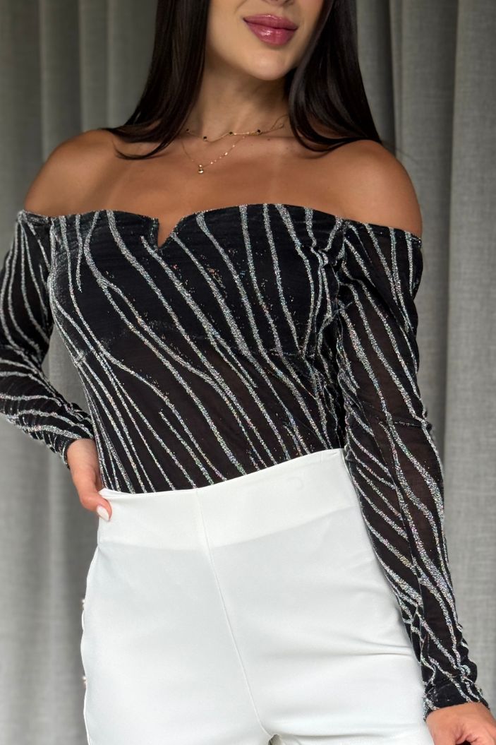 Body ajustado confeccionado en licra con brillo, una tela elástica, suave y cómoda que se adapta perfectamente al cuerpo. Su diseño en color negro con líneas irregulares plateadas crea un efecto luminoso y elegante. Presenta mangas largas y un atractivo escote tipo off-shoulder que realza los hombros y aporta un toque sofisticado. Su estructura tipo body garantiza un ajuste firme y estilizado.
