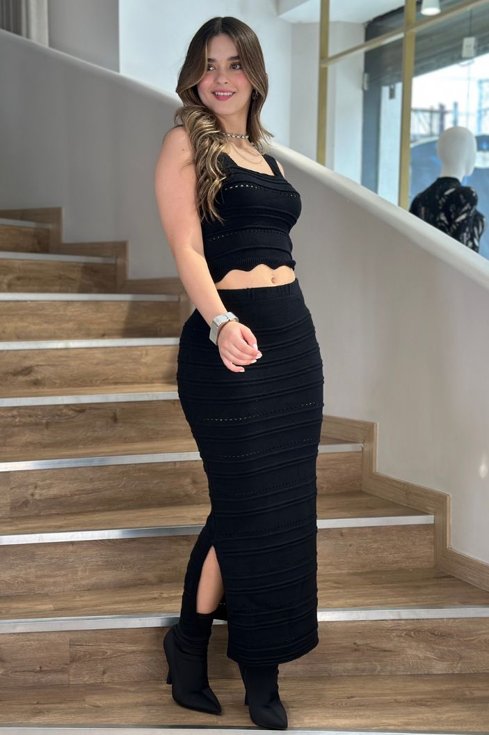 Conjunto de dos piezas combina comodidad y estilo con un diseño tejido que evoca calidez y naturalidad. El top tipo crop con escote cuadrado y terminaciones onduladas se complementa perfectamente con la falda midi de cintura alta y abertura lateral que estiliza la silueta.