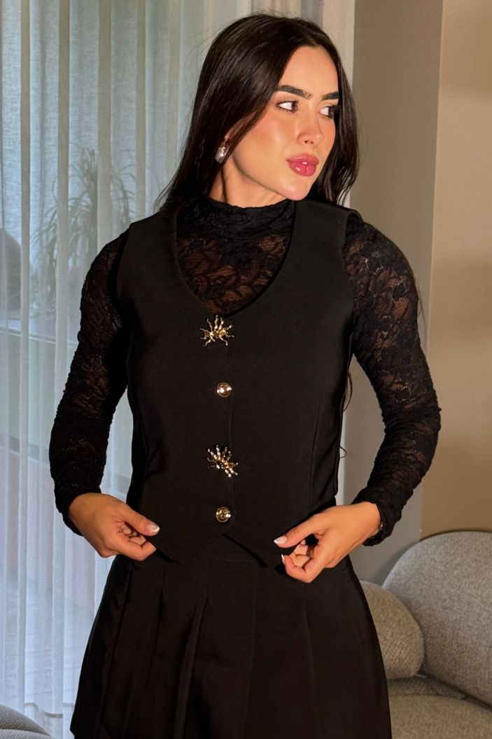 Chaleco tipo sastre, confeccionado en una tela de alta densidad y estructura firme que garantiza una silueta pulida. Presenta un diseño de escote en V profundo y base en punta, destacando por su cierre frontal de botones metálicos dorados intercalados con exclusivos apliques en forma de sol que elevan la prenda a un nivel de lujo artesanal.
