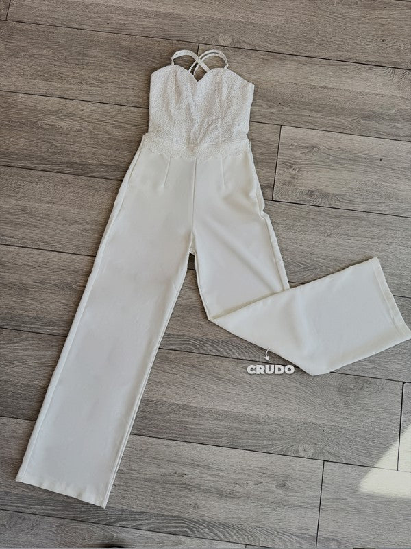 Enterizo fresco y elegante ideal para días soleados o salidas casuales con un toque chic. El top blanco con textura de encaje y tiras delgadas realza el escote con su silueta tipo corset, mientras que el pantalón en tono beige claro, de tiro alto y bota ancha, alarga visualmente la figura y aporta una estética pulida.
