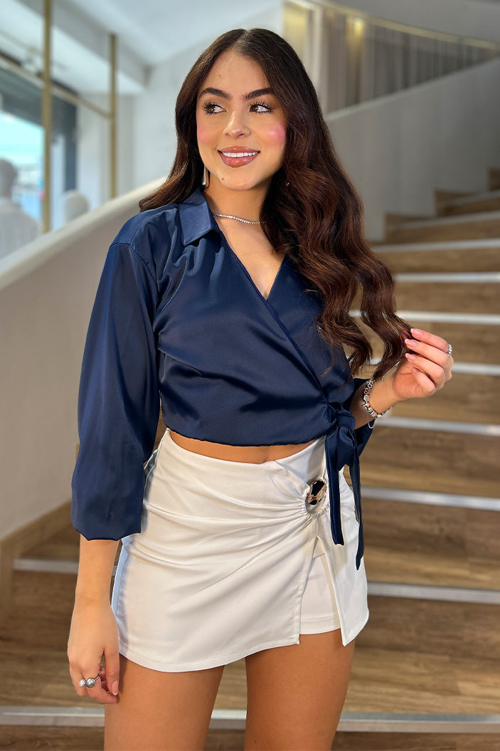 Falda short vinotinto de tiro alto con diseño cruzado en la parte frontal y detalle decorativo de botón metálico plateado. Confeccionada en tela suave con caída ligera que brinda comodidad y un toque sofisticado.