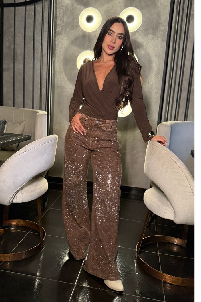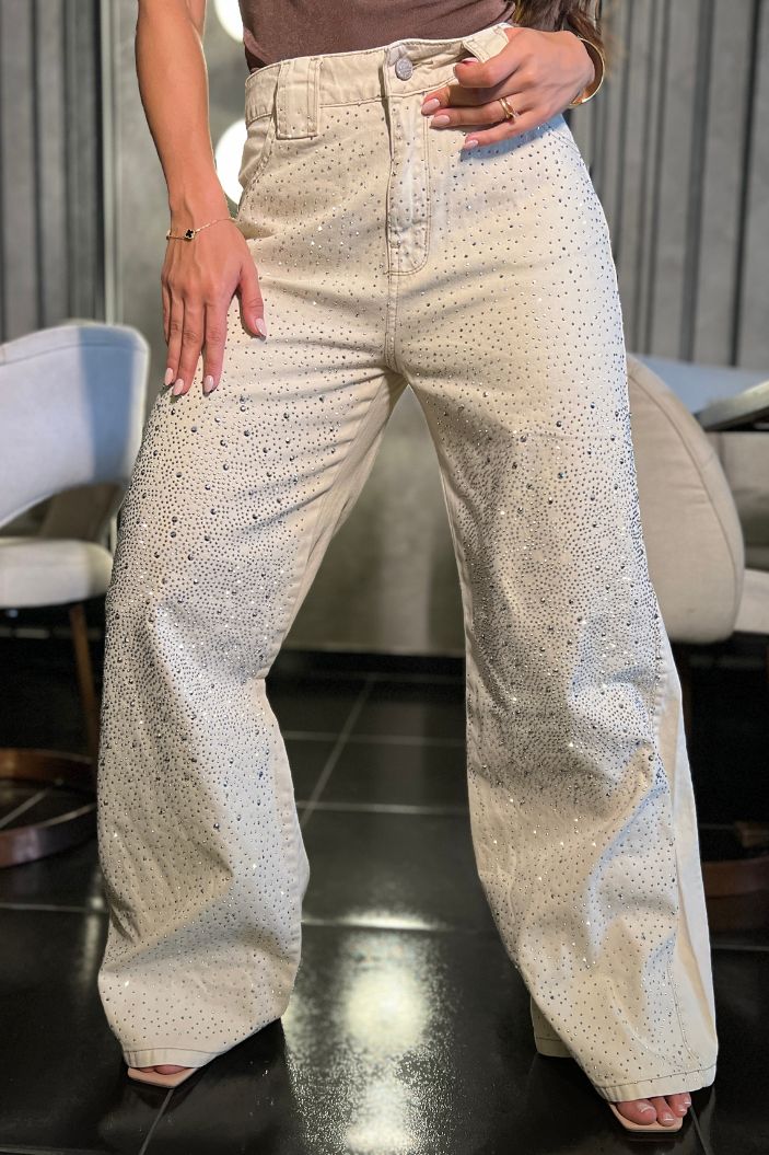 Pantalón de tiro alto con corte recto y detalles de brillos que aportan un toque glamuroso. Su diseño combina elegancia y comodidad, ideal para destacar en cualquier ocasión.