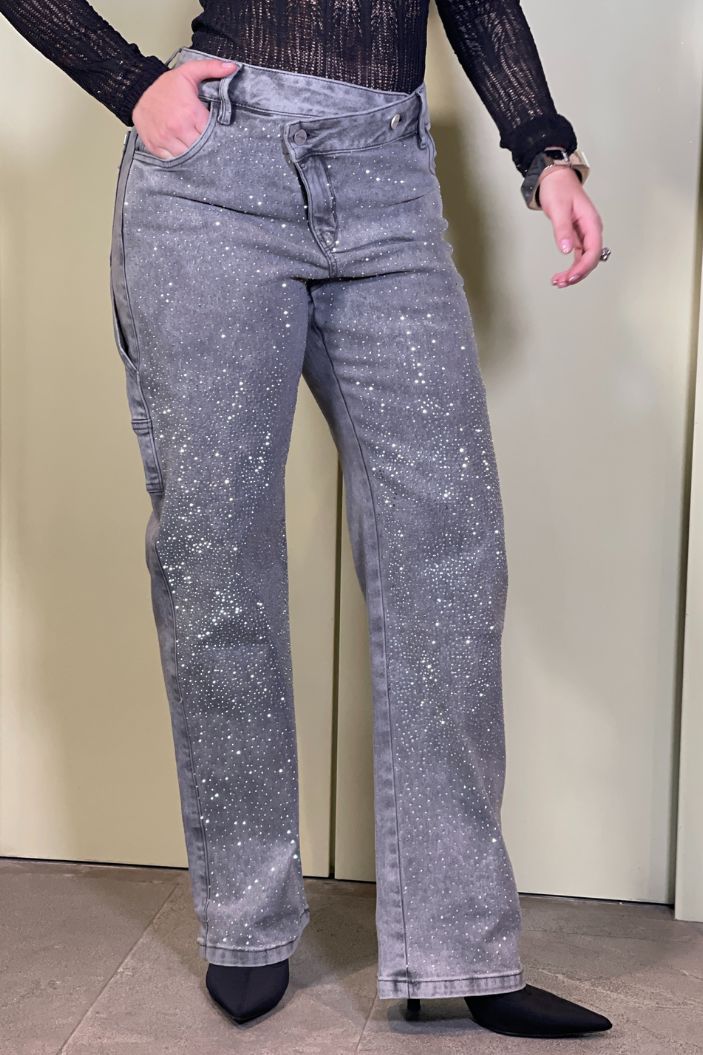 Jean moderno de silueta recta con detalles de microbrillos en la parte frontal que aportan un toque elegante y llamativo. Su denim suave y cómodo permite un ajuste favorecedor y versátil para distintos estilos.