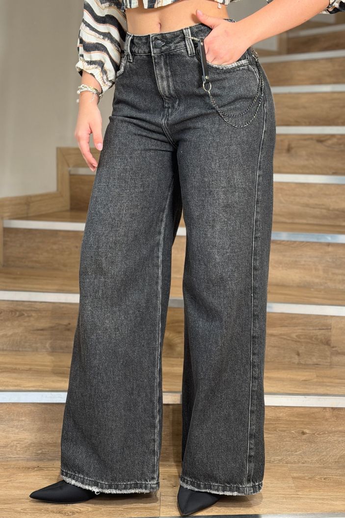 Jeans de tiro alto, confeccionados en denim elástico de alta resistencia con un lavado gris oscuro/negro. Presentan un corte wide leg que ofrece una caída fluida y moderna, destacando por su accesorio de cadena metálica en la cintura y un acabado deshilachado en el ruedo que aporta un toque rebelde.