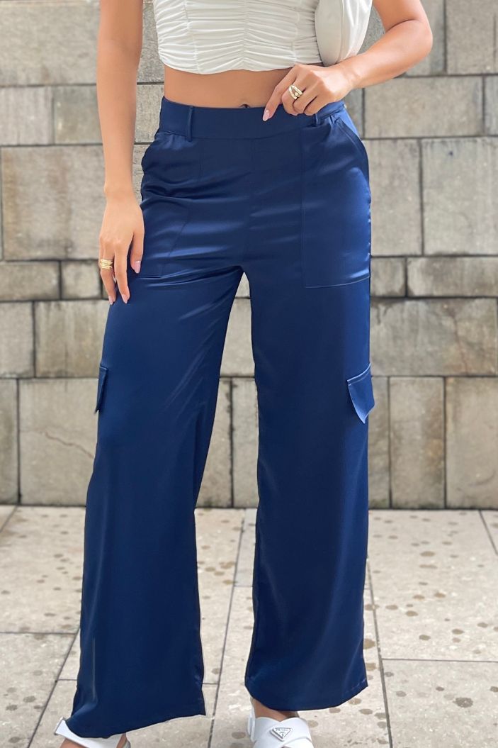 Pantalón tipo cargo en satín, de tiro alto y corte amplio. Con bolsillos utilitarios que le dan un aire moderno y sofisticado, combina comodidad con un acabado elegante.