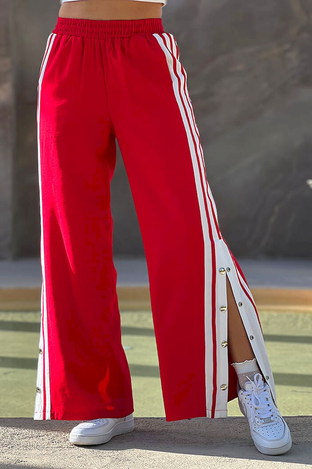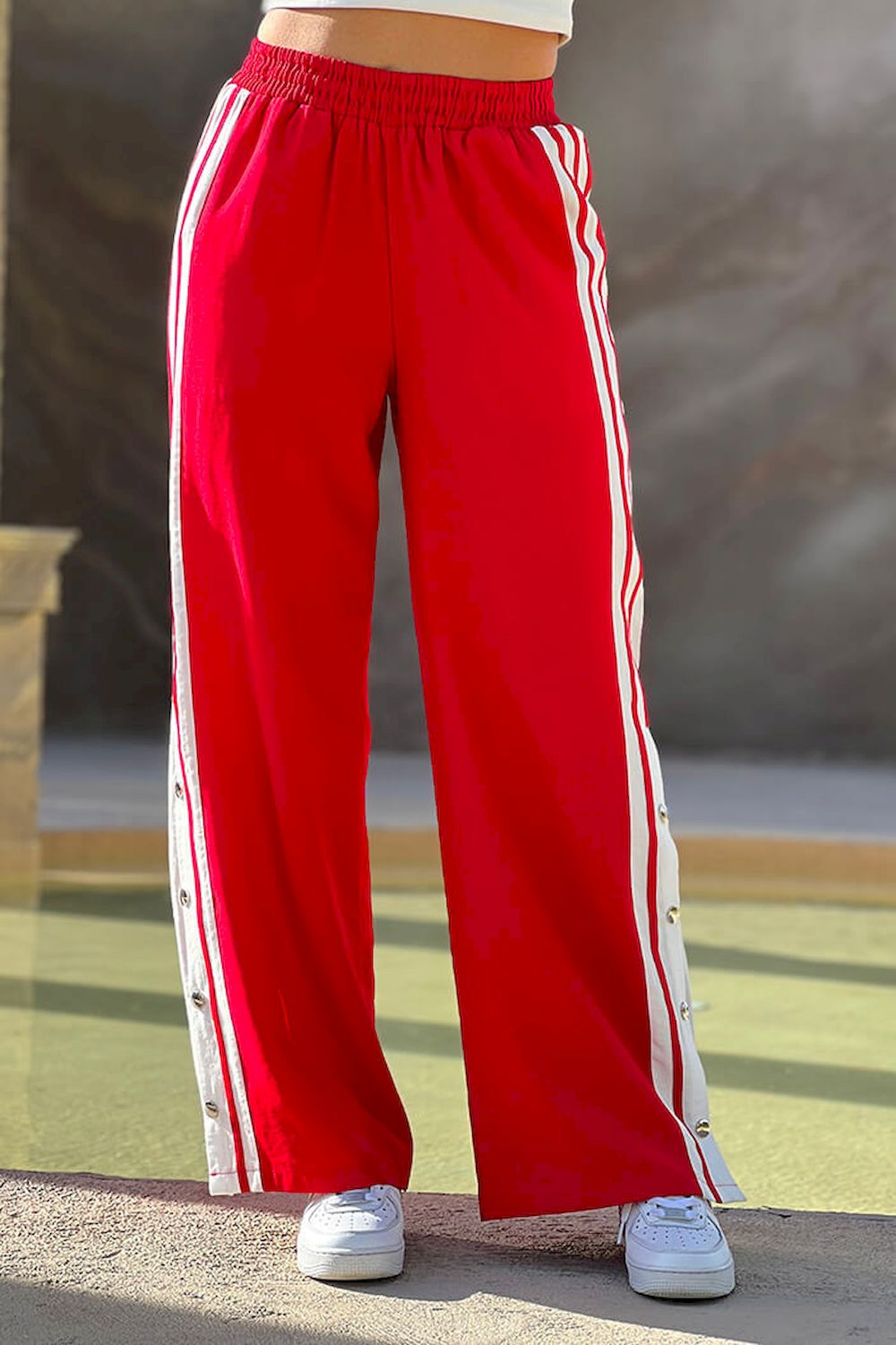 Pantalón tipo jogger ancho, confeccionado en tela suave y cómoda. Presenta pretina elástica de ajuste práctico y franjas laterales blancas que estilizan la silueta. Incluye aberturas con broches en los costados que permiten usarlo cerrado o con un toque más atrevido y ventilado.