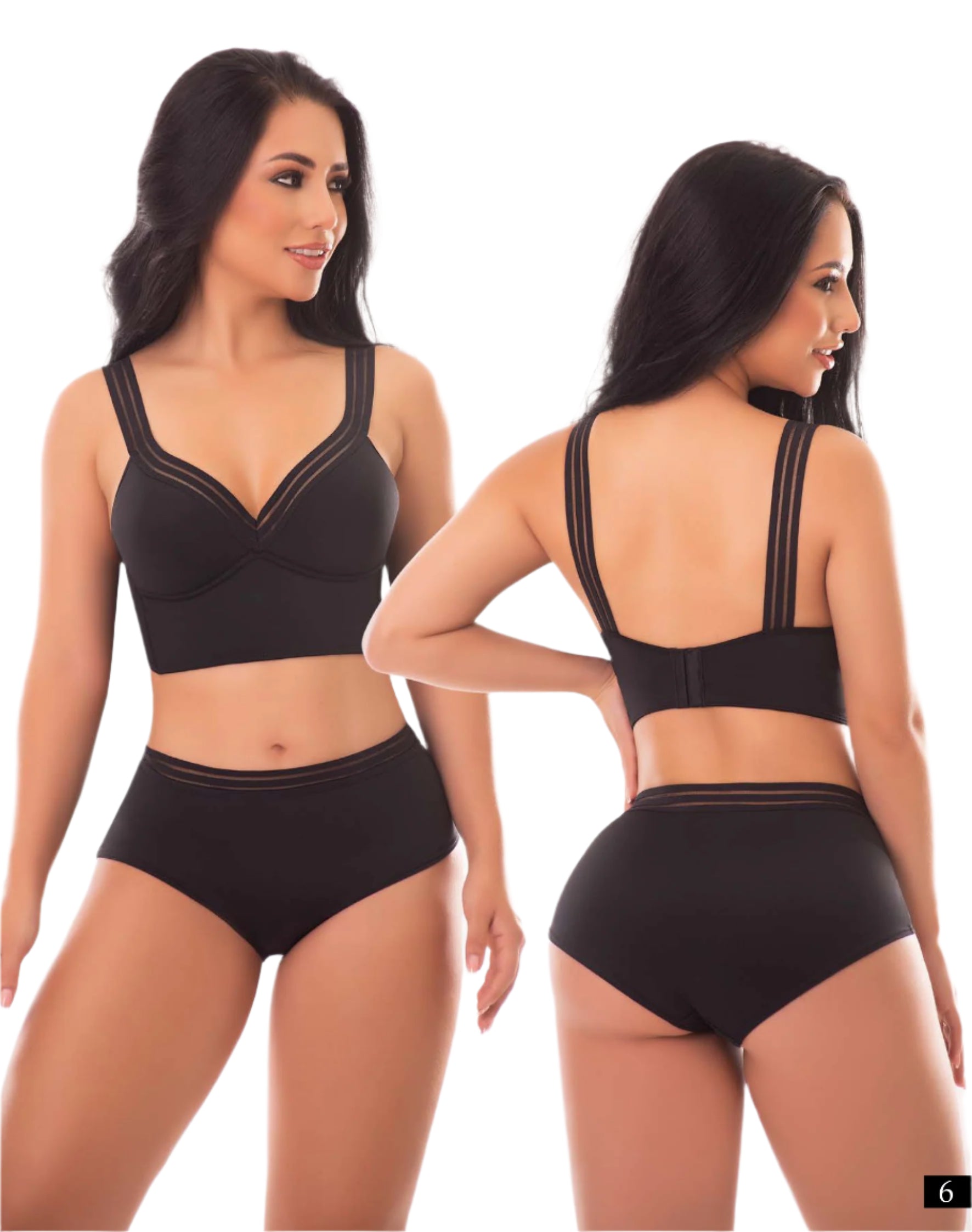 Conjunto elaborado en microfibra. Copa triangulo con realce interno sin varilla de arco, con varilla lateral, base, broche ancho y elástico organza en cargadera suave al tacto, Cachetero elaborado en microfibra con elástico organza.
