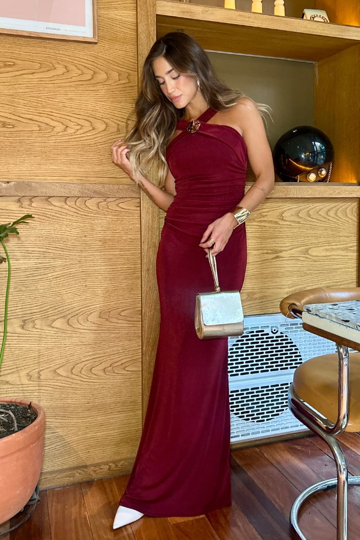 Vestido largo con detalle dorado en el escote, elaborada en poliéster con elastano
