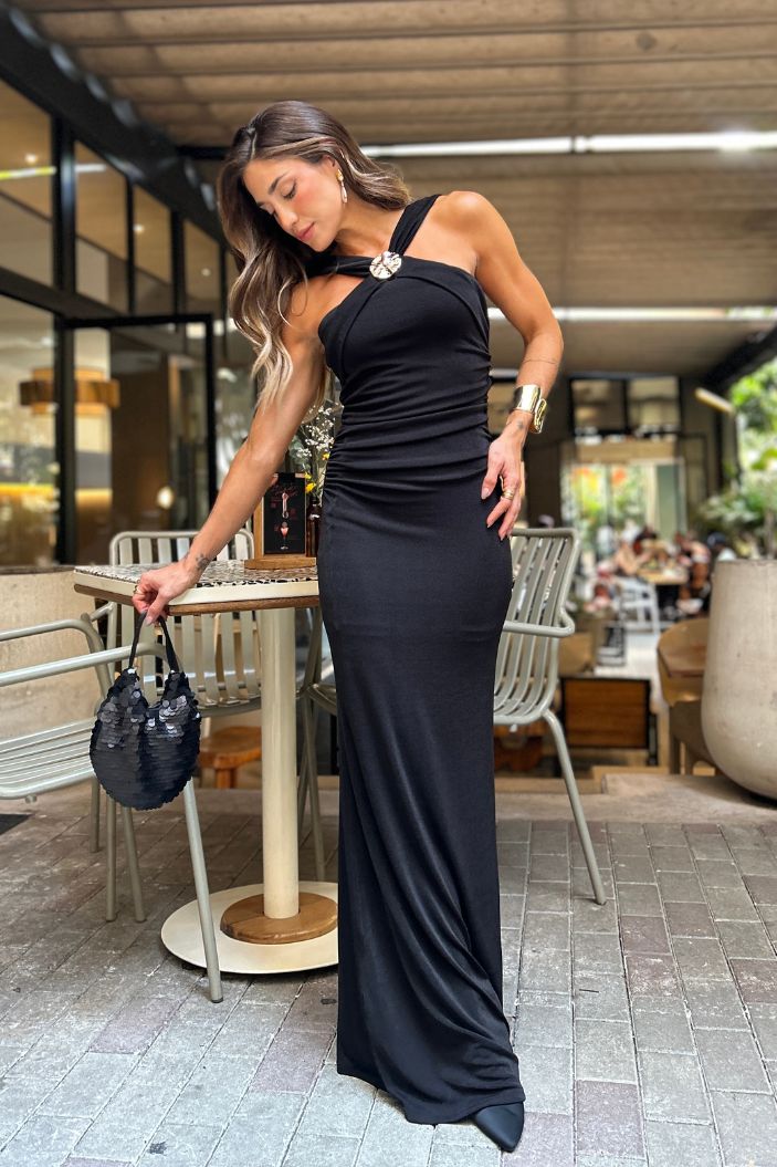 Elegante y sofisticado. Vestido largo negro con escote halter adornado con detalle dorado y silueta ajustada que realza la figura.